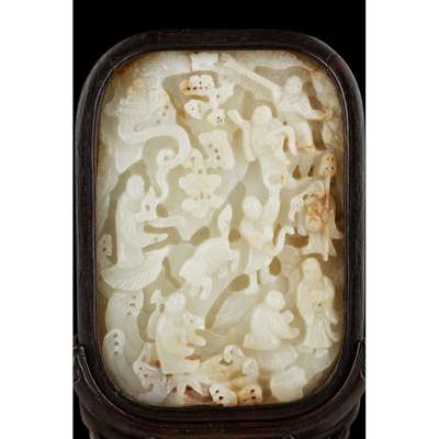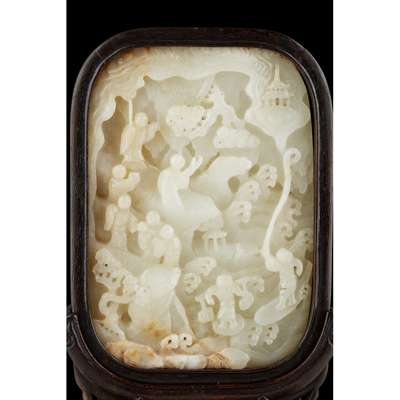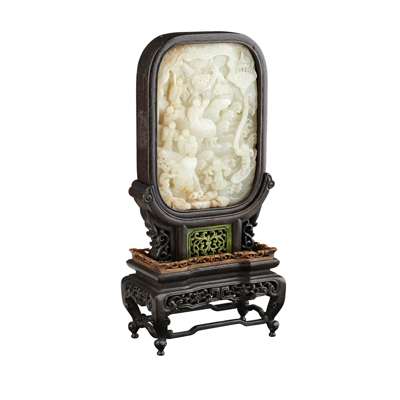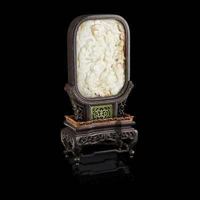 CARVED WHITE JADE PLAQUE MOUNTED AS A TABLE SCREEN