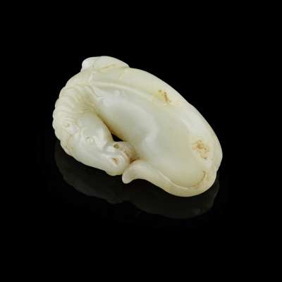 the horse carved in a recumbent position with head turned backward playfully touching the hoof of the hindleg, with finely incised mane, the jade of a pale celadon tone