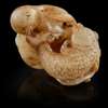 depicting the dramatic moment of an owl swooping from the sky and plucking a carp from the waters, a large lotus leaf forming the base of the figural group