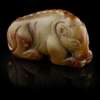 the bear shown recumbent with head facing forward with a pronounced snout, the body incised with S-shaped scrolls simulating the mane, the stone of a green colour accentuated with attractive russet skin