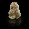 the boy shown atop a recumbent qilin, holding a branch of lotus, the face with jovial expression, the stone of a grey celadon colour with russet inclusions