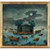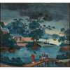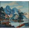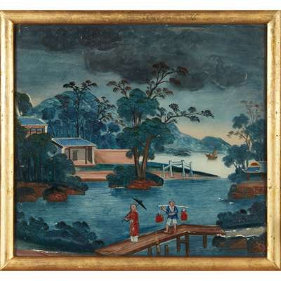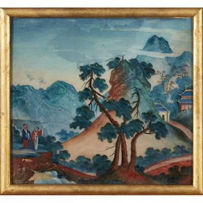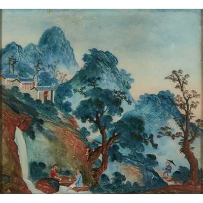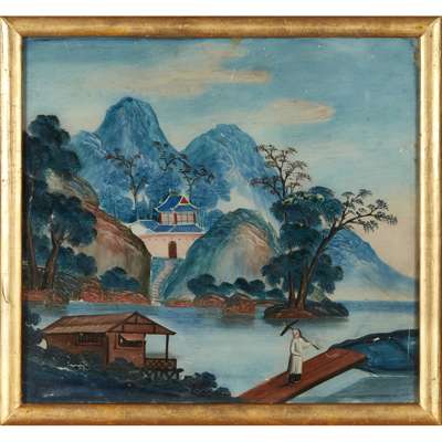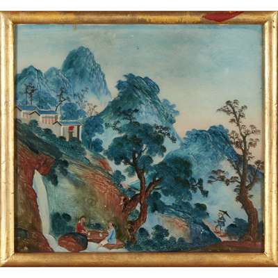 depicting figures at various leisurely pursuits in mountainous landscapes, for example a scholar contemplating the landscape on a bridge, accompanied by an attendant, a scholar ascending the steps leading towards a mountain retreat, two scholars drinking tea beside a waterfall, in gilt wooden frames (8)