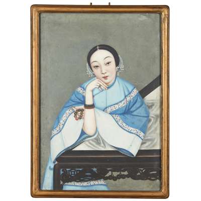 oil on canvas, each depicting a young lady seated wearing a pale blue embroidered robe, with one hand clasped supporting her chin, the other holding a sprig of flowers in the first portrait and a beaded bracelet in the second, the body leaning against an elaborately carved zitan table with inset dreamstone panel, the face with a contemplative expression (2)
