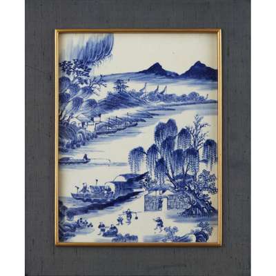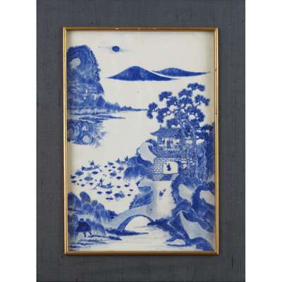 the first painted in fine shades of cobalt blue with scholars gathered in a lakefront pavilion with a view towards distant mountains, and with ladies being ferried across a lotus pond, 37x25cm; the second similarly painted with figures in boats in a mountainous landscape, 32.5x25cm; the third depicting birds and flowers, 26x21cm (3)