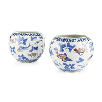the stoutly potted globular body painted in underglaze blue and copper-red highlights with a continuous frieze of fish, shrimps and crabs swimming amongst aquatic plants, all above a band of crested waves at the foot and below a border of ruyiheads encircling the mouth (2)