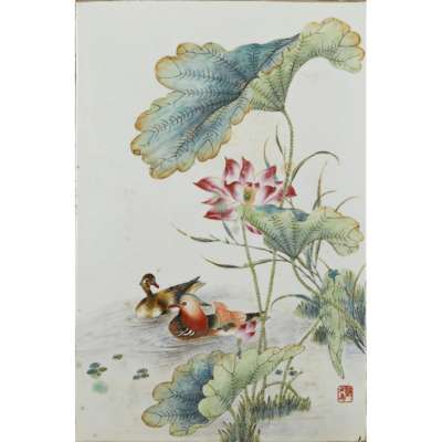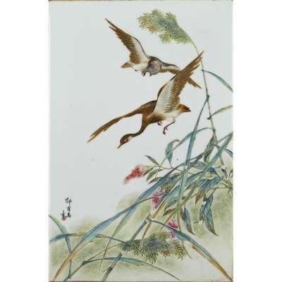 depicting cranes beneath pine trees, wild geese flying above flowering pink sages, mandarin ducks swimming in a lotus pond, and ducks swimming beneath magnolia, each with one seal of Deng Xiaoyu, one signed 'painted by Deng Xiaoyu' (4)