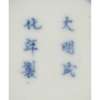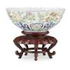 delicately potted with deep rounded sides rising from a straight foot to a barbed rim, delightfully painted to the exterior with flowering lotus, prunus, chrysanthemum and peony sprays, all above a band of auspicious ruyi-shaped petal lappets radiating around the foot, the base with a six-character apocryphal Chenghua mark, with wood stand