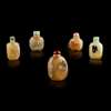 GROUP OF FOUR AGATE SNUFF BOTTLES AND A QUARTZ SNUFF BOTTLE