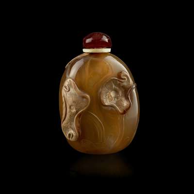 the first a cameo agate bottle, of rounded rectangular form, carved with a cameo design of a pair of birds perched on rocks; the second of flattened ovoid form, carved with a carp leaping amongst lotus leaves; the third of rounded form, carved with a carp swimming in a lotus pond; the fourth of flattened globular form, carved with a monkey reining in a horse; the fifth a quartz bottle, of rounded rectangular form, carved with figures in a landscape (5)