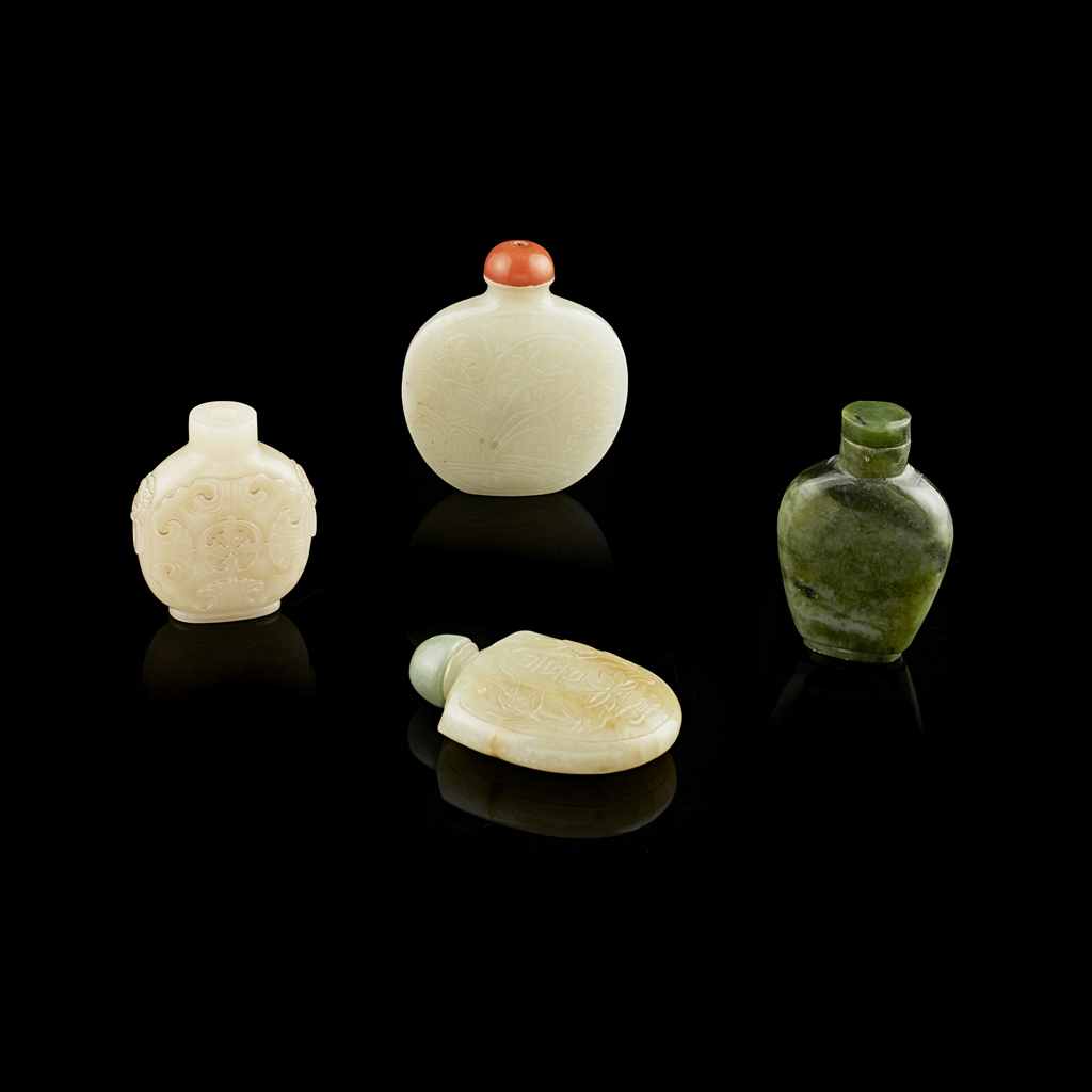 comprising: a flattened white jade bottle, one side carved with orchid, the other with prunus, inscribed with a poetic couplet; a flattened spinach-green bottle; a grey jade archaistic bottle, carved with foliage and a pair of mask handles with affixed rings; a greyish celadon bottle, carved with double happiness symbols surrounded by lotus scrolls (4)