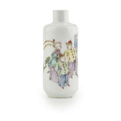 painted with three military figures in Qing costume in front of the gate of a fortified city presided over by a general calmly stroking his beard, the base with a four-character iron-red seal mark