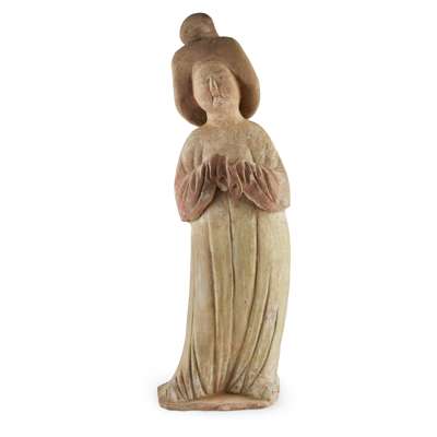 the elegant standing figure clad in a pleated gown, with hands clasped at the front, the hair arranged in an elaborate topknot, with remnants of paint (2)