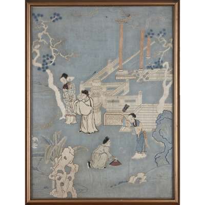 depicting a young lady, possibly Xue Baochai from the 'Dream of the Red Chamber', catching a pair of butterflies with a male attendant, beside a young couple, possibly Jia Baoshu and Lin Daiyu, courting beneath a tree in front of a pavilion, the lower right corner inscribed with 'Jing', framed and glazed