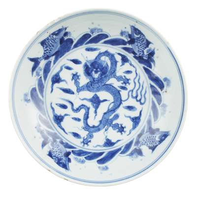 BLUE AND WHITE 'DRAGON AND CARP' DISH