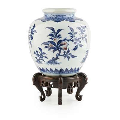 COPPER-RED DECORATED BLUE AND WHITE 'THREE ABUNDANCES' OVOID VASE