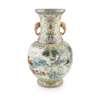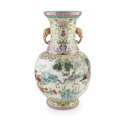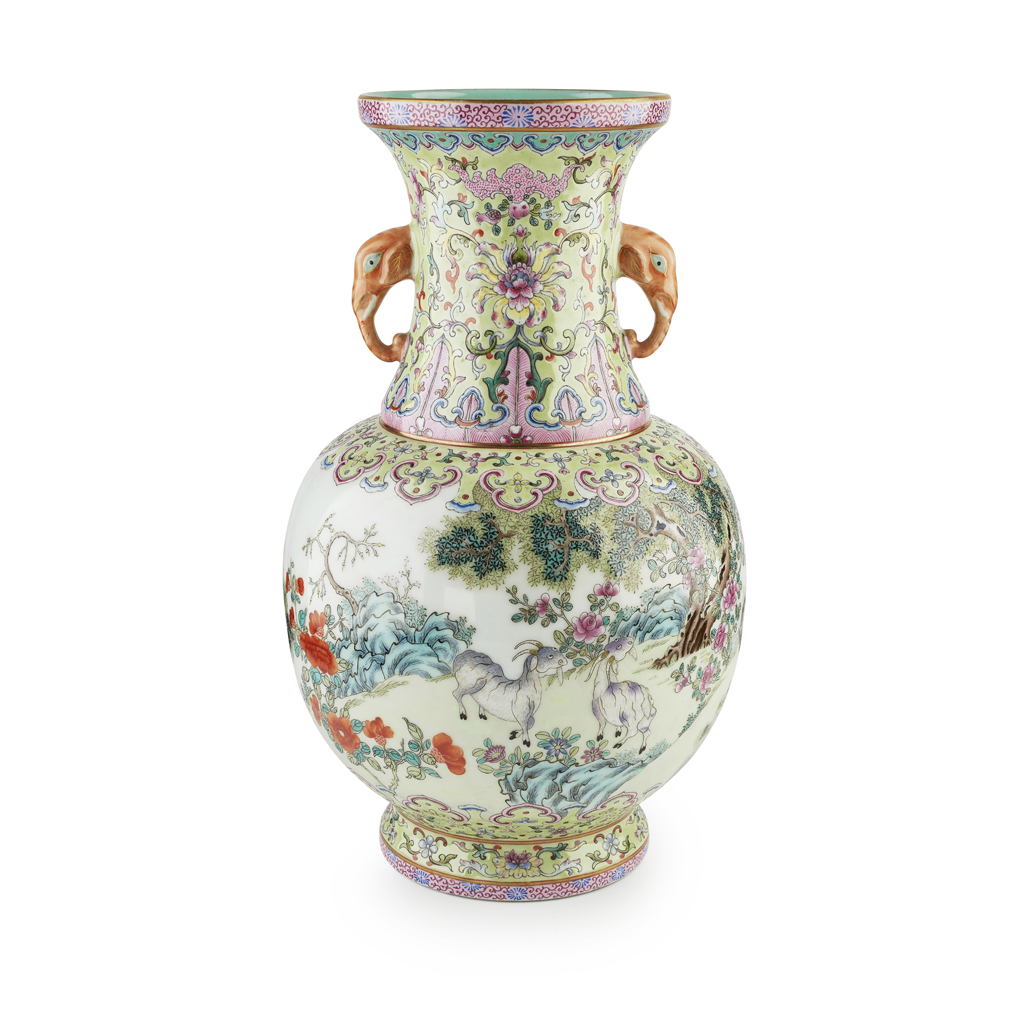 the globular body painted with three rams in a rose garden, the shoulder, neck and foot painted with lotus scrolls on a lime-green ground, with a pair of elephant head handles, the interior glazed turquoise, the base with an apocryphal Qianlong mark