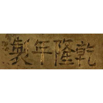 the pear-shaped body supported on a splayed foot mounted on a circular lotus base, the neck applied with a pair of lion masks suspending loose rings, enamelled overall with lotus flowerheads issuing from scrolling vines, the base with an apocryphal Qianlong mark