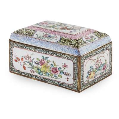 the graduated cover decorated in polychrome enamels with a rectangular panel depicting blossoming flowers and fruiting peach, the sides of the box with four further flower and fruit panels