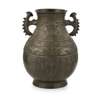 cast around the exterior in low relief with a taotie mask band above cicada lappets enclosing pairs of phoenix, the neck inlaid in gold and silver with two large taotie masks and set with a pair of phoenix handles
