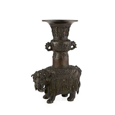 heavily cast in the shape of a caparisoned elephant supporting a gu-form vase upon its saddle, the animal adorned with beaded jewellery, the saddle cloth decorated with flowering lotus scrolls, embellished with pearls and coloured semi-precious stones