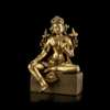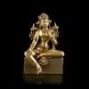 cast seated in dhyanasana on a double-lotus base, the right hand lowered in varadamudra, the left hand raised to the chest in vitarkamudra, wearing a dhoti and a celestial scarf around the body, adorned with beaded jewellery at the waist, arms, and feet, the face tilted downward and the hair pulled into a high chignon