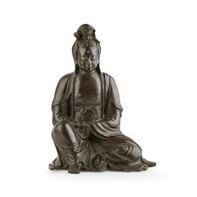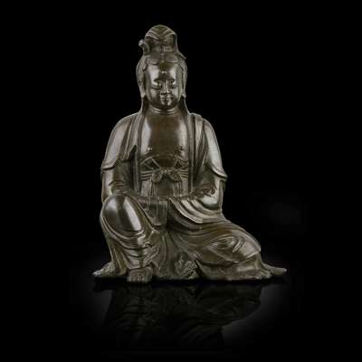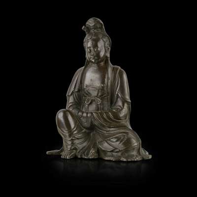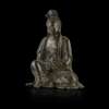 the Goddess of Mercy shown seated in rajalilasana, the hands hidden in the sleeves of the gracefully draped robes open at the chest, the hair gathered in a topknot secured by hair pin beneath a cowl falling upon the shoulder, the face with a contemplative expression