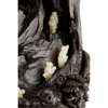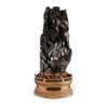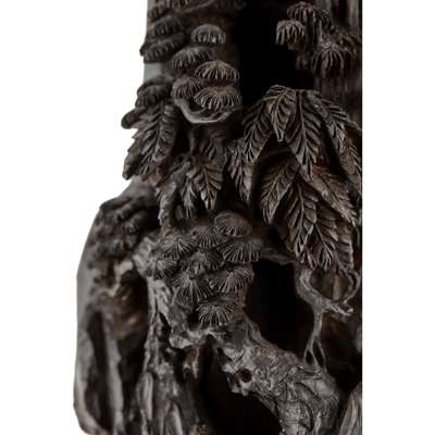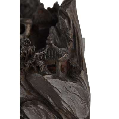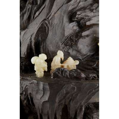 elaborately carved with five small jade figures ascending the steps of a steep mountain hosting craggy rocks, pines and a pavilion and a cottage perched on the peak, supported on a separate wooden plinth