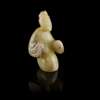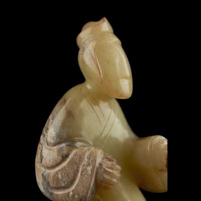 the elegant figure well carved, wearing a long gown with wide sleeves flanking her long narrow torso, the jade of a translucent yellow tone, the calcified areas cleverly integrated into the composition to form the sleeves and the hair of the figure
