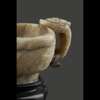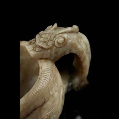 the deep vessel carved with a pouring lip to one end and a kuilong handle to the other, the sides carved in shallow relief with two kuilong amid scrolling clouds, the stone of grey celadon tone with black veins, wooden stand