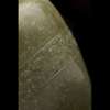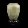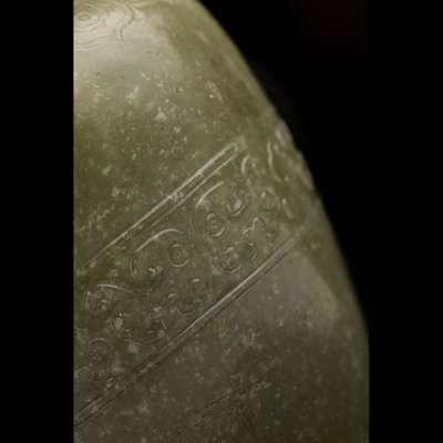 the mid-section encircled by a wide band of archaistic scrolls, bordered by a lappet band at the mouth and a ring of bosses at the foot, the jade of a greyish green tone with russet and icy inclusions