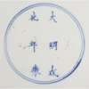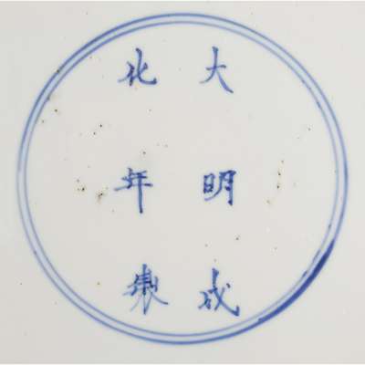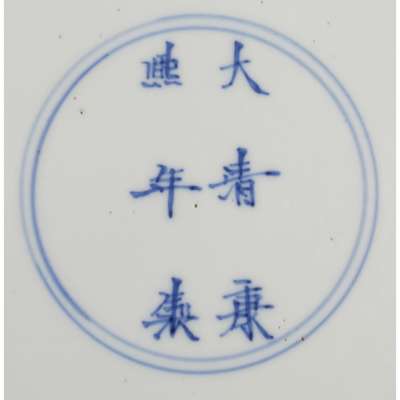 four painted with a young scholar courting a lady, the fifth with two scholars drinking and playing Go, the sixth with a scholar and an attendant watching the moon, the seventh with a scholar and a monk engaged in conversation, six dishes with six-character Kangxi reign marks, one with an apocryphal Chenghua mark (7)