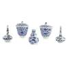 comprising: a pair of 'floral' tea cups and covers; a pair of miniature bottle vases, each painted with a bird amongst flowering prunus; and a small double-gourd form Delft vase (5)