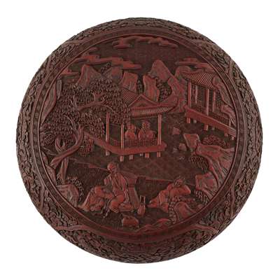 the cover carved in high relief with an elderly scholar and young attendant in a lakeside pavilion, the foreground populated by three ladies taking a nap, the landscape with rich vegetation and craggy rocks, all encircled by bands of keyfret, the sides of the box and cover each with four quatrelobed cartouches containing blossoming and fruiting plants, all reserved against diaper grounds, the interiors and base lacquered black