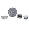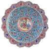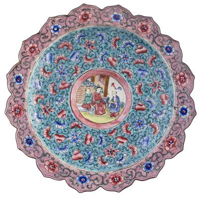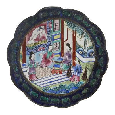 the first a tea cup with a flared rim, painted with figures in a landscape within two panels reserved on a blue basse-taille enamel ground; the second a similarly decorated lobed box and cover, the cover painted with a Mandarin official and family in a garden; together with a CANTON ENAMEL LOBED SAUCER; and an CANTON ENAMEL OVAL BRUSH WASHER (4)