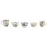 the first painted with a bird and two butterflies amongst composite floral sprays; the second painted with five men engaged in an animated conversation whilst travelling in a boat, accompanied by a lady and a boy in a second boat; the third of similar design; the fourth an Imari-palette cup, painted with a phoenix and a mythical horse in a garden; the fifth painted with a pair of pheasants (5)