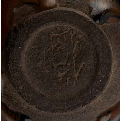 potted with deep rounded sides rising from a short foot to a silver-mounted rim, covered with a thick black glaze finely streaked with 'hare's fur' markings, stopping irregularly above the foot exposing the dark brown body