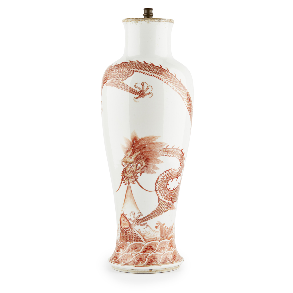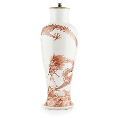 the baluster body rising from a splayed foot to a gently flared mouthrim, decorated with a continuous scene of a ferocious five-clawed dragon above a giant carp leaping out from turbulent raging waves, mouth sealed for lamp fittings