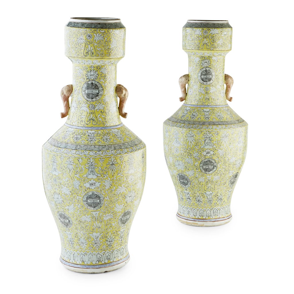 PAIR OF GRISAILLE-DECORATED YELLOW-GROUND ELEPHANT-HANDLE VASES
