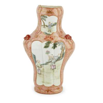 of baluster form with lobed sides and a flattened back, decorated on an iron-red ground with two panels enclosing figures under pine trees, the base with an apocryphal four-character Qianlong seal mark