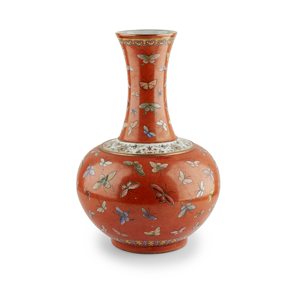 FAMILLE ROSE CORAL-RED GROUND 'HUNDRED BUTTERFLIES' BOTTLE VASE