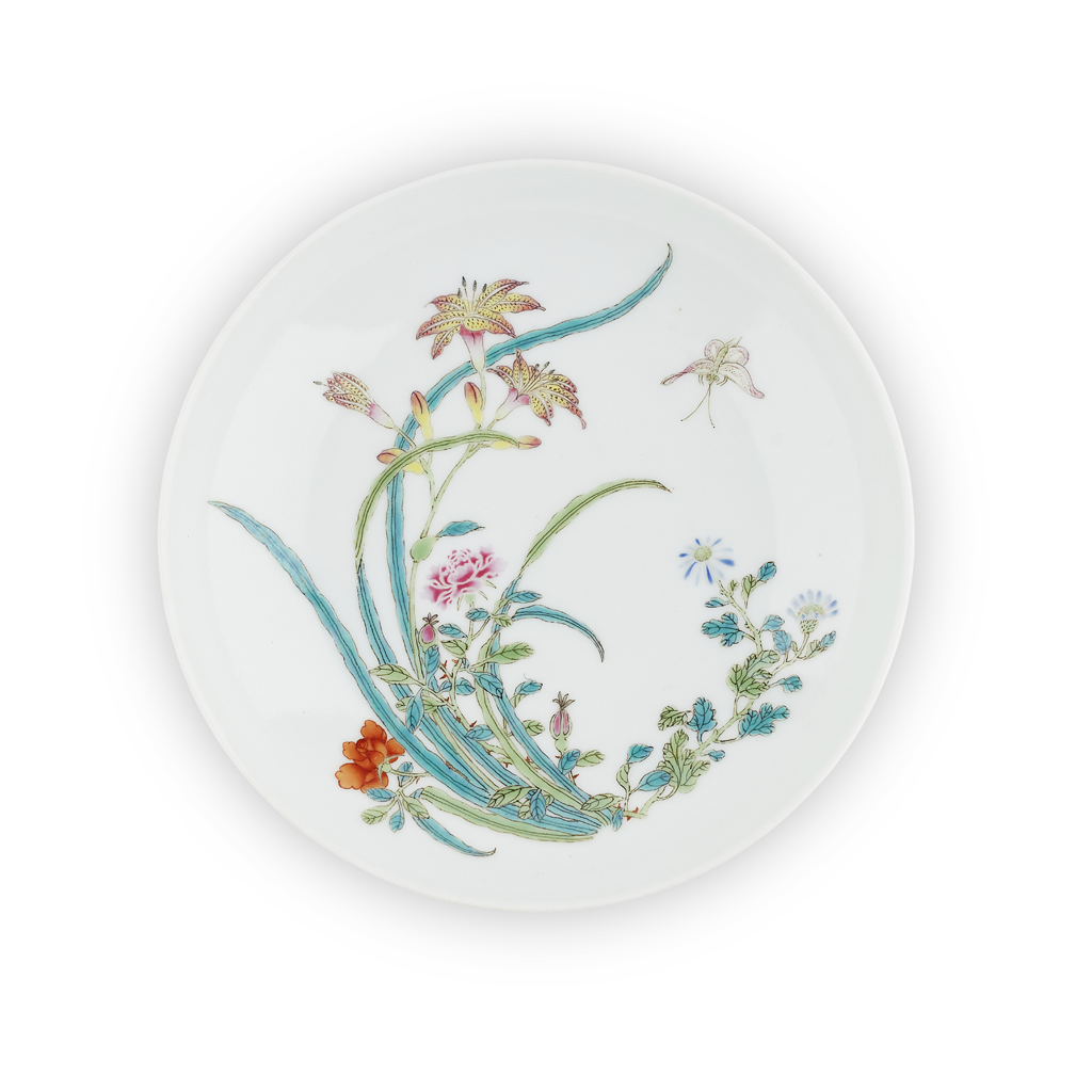 enamelled with a single butterfly hovering over lush sprays of blossoming flowers, raised on a high circular foot, the base unmarked