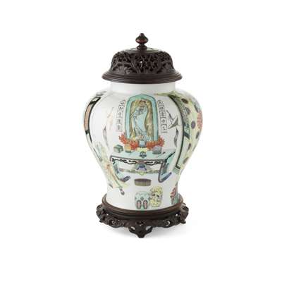 painted and gilt with a portrait of Guanyin flanked by a poetic couplet, behind an altar table supporting various scholar's objects, two scholars and a monk engaged in an animated conversation nearby, the base with an apocryphal mark within double circles, with finely pierced wooden cover and stand