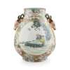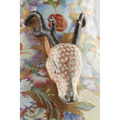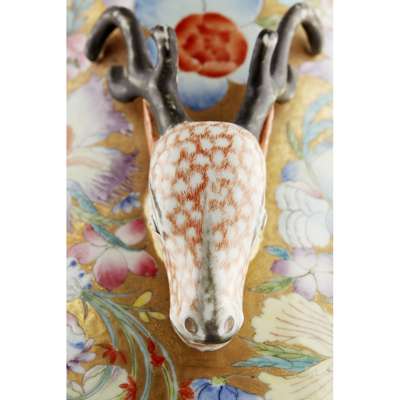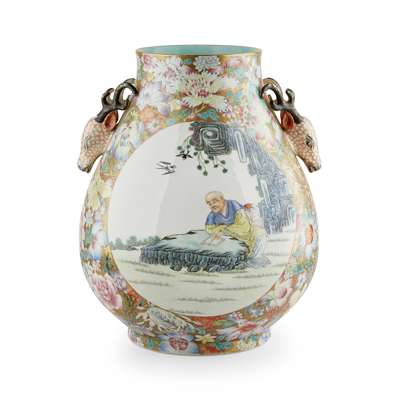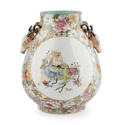 the bulbous body decorated with two circular panels, one depicting the Laughing Buddha playing with six boys, the other a luohan reading a book in a rocky setting, reserved on a gilt decorated millefleur ground, flanked by a pair of stag head handles, the base with an apocryphal Qianlong seal mark