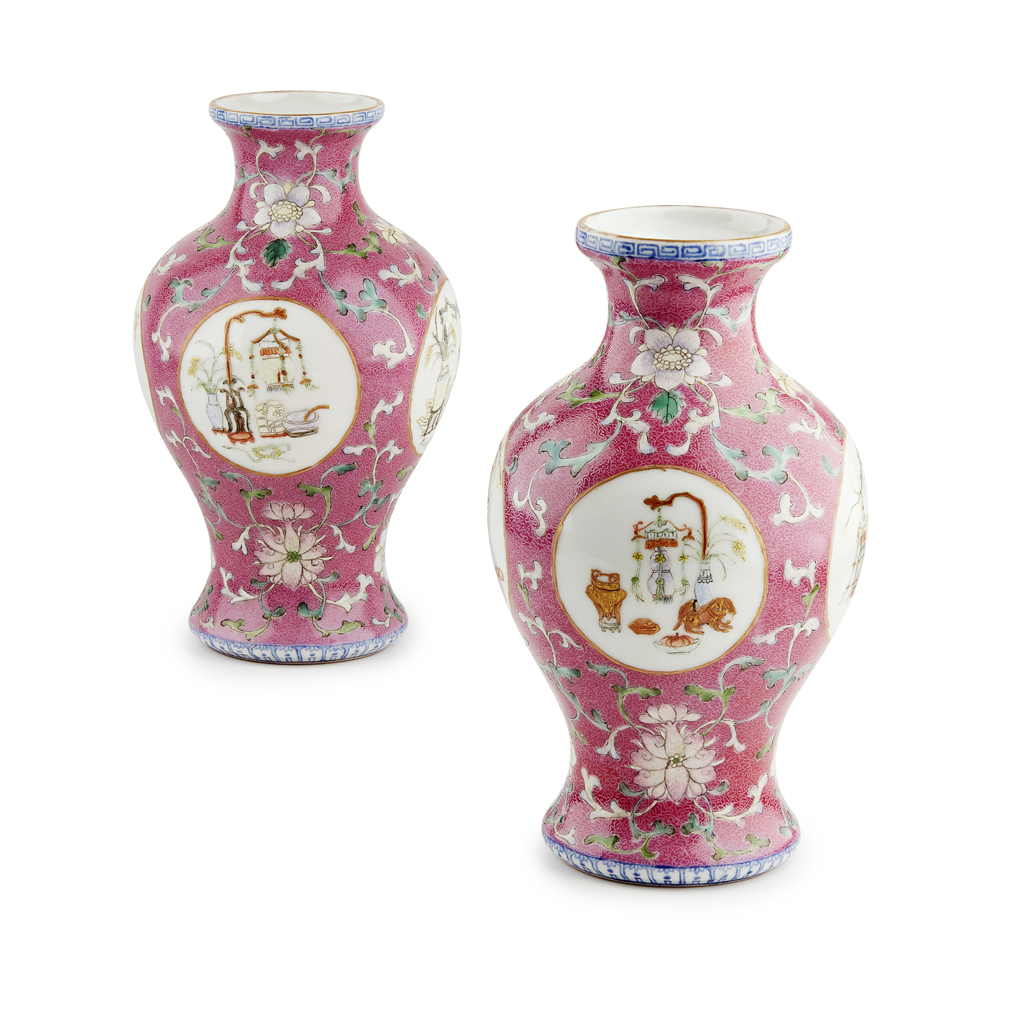 each painted with four medallions containing arrangements of precious antiques, all reserved on a ruby ground incised with scrolling tendrils, the base with a six-character apocryphal Yongzheng reign mark (2)