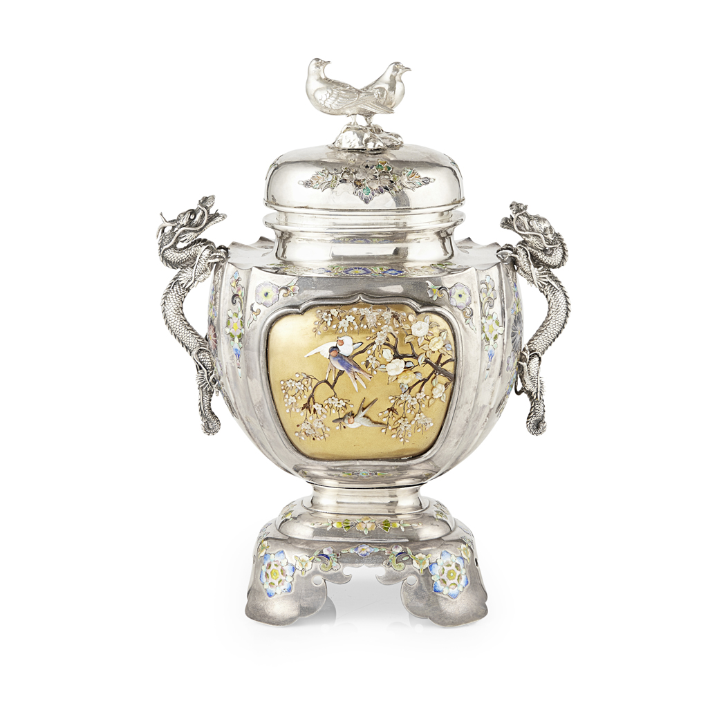FINE SILVER, CLOISONNÉ-ENAMEL AND SHIBAYAMA-INLAY CENSER AND COVER, KORO Y
