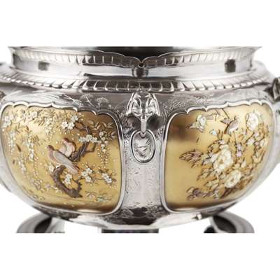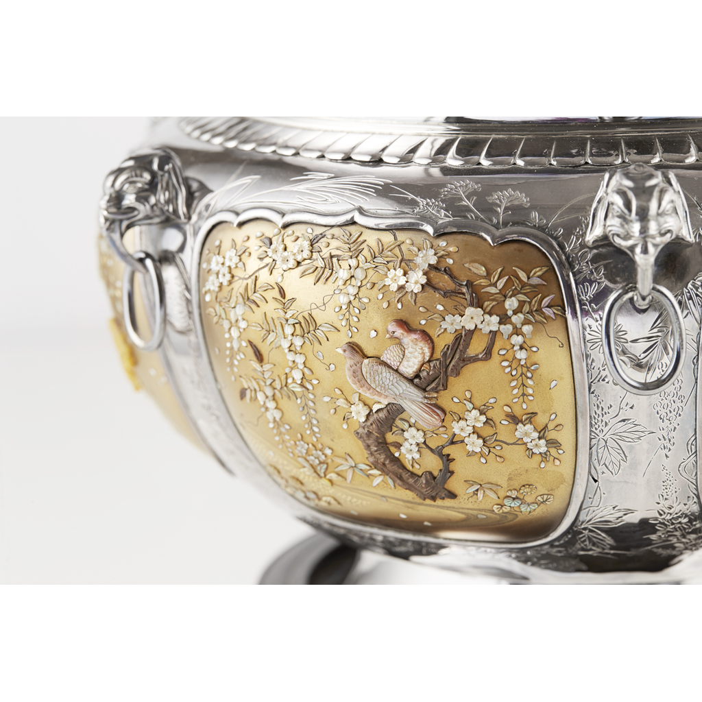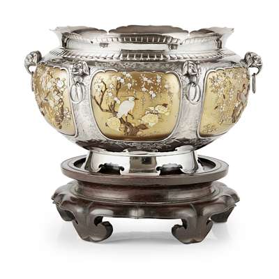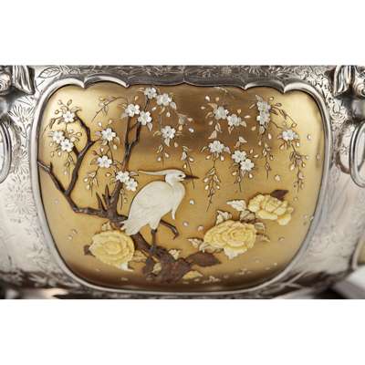 MAGNIFICENT GOLD-LACQUERED SHIBAYAMA-INLAID SILVER BOWL Y