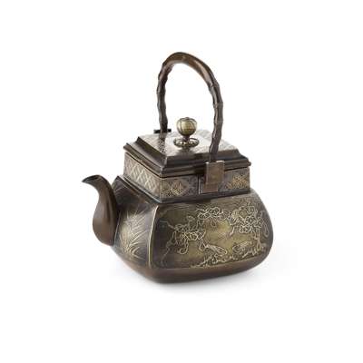 the lobed sides inlaid in mixed metal with birds and flowers below a floral diaper band around the square-section neck, the lid applied with a chrysanthemum finial