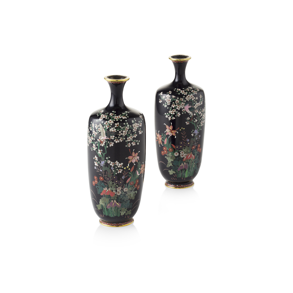PAIR OF MIDNIGHT-BLUE GROUND CLOISONNÉ ENAMEL VASES