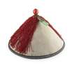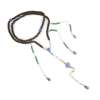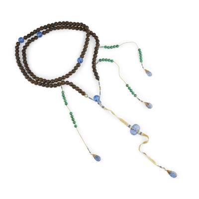 the main strand comprising wooden beads interspersed with larger blue glass beads, the side strands with malachite beads terminating in pearls and pear-shaped blue glass pendants, the central lower silk strand with blue glass pendants; together with an OFFICIAL'S HAT, 32cm wide (2)