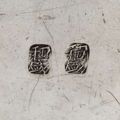 the exterior of the cover finely repoussé worked with scholar-officials gathered in a vast courtyard adorned with prunus, pine, willow and various seasonal flowers, whilst their attendants, dressed as warriors, perform a show of martial arts, the four sides of the box similarly decorated with scholar-officials engaged in different leisurely pursuits, marked 'He Sheng' twice to the underside